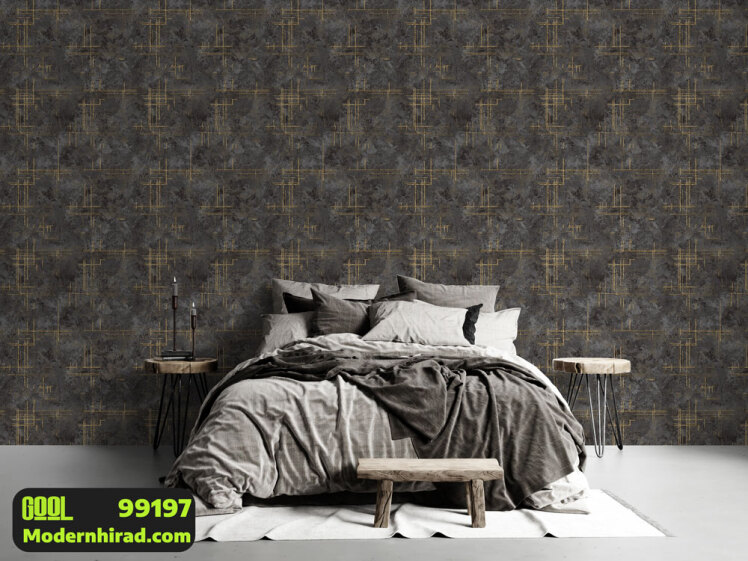 کاغذدیواری طرح مدرن مشکی با خطوط افقی و عمودی طلایی شاین دار 99197